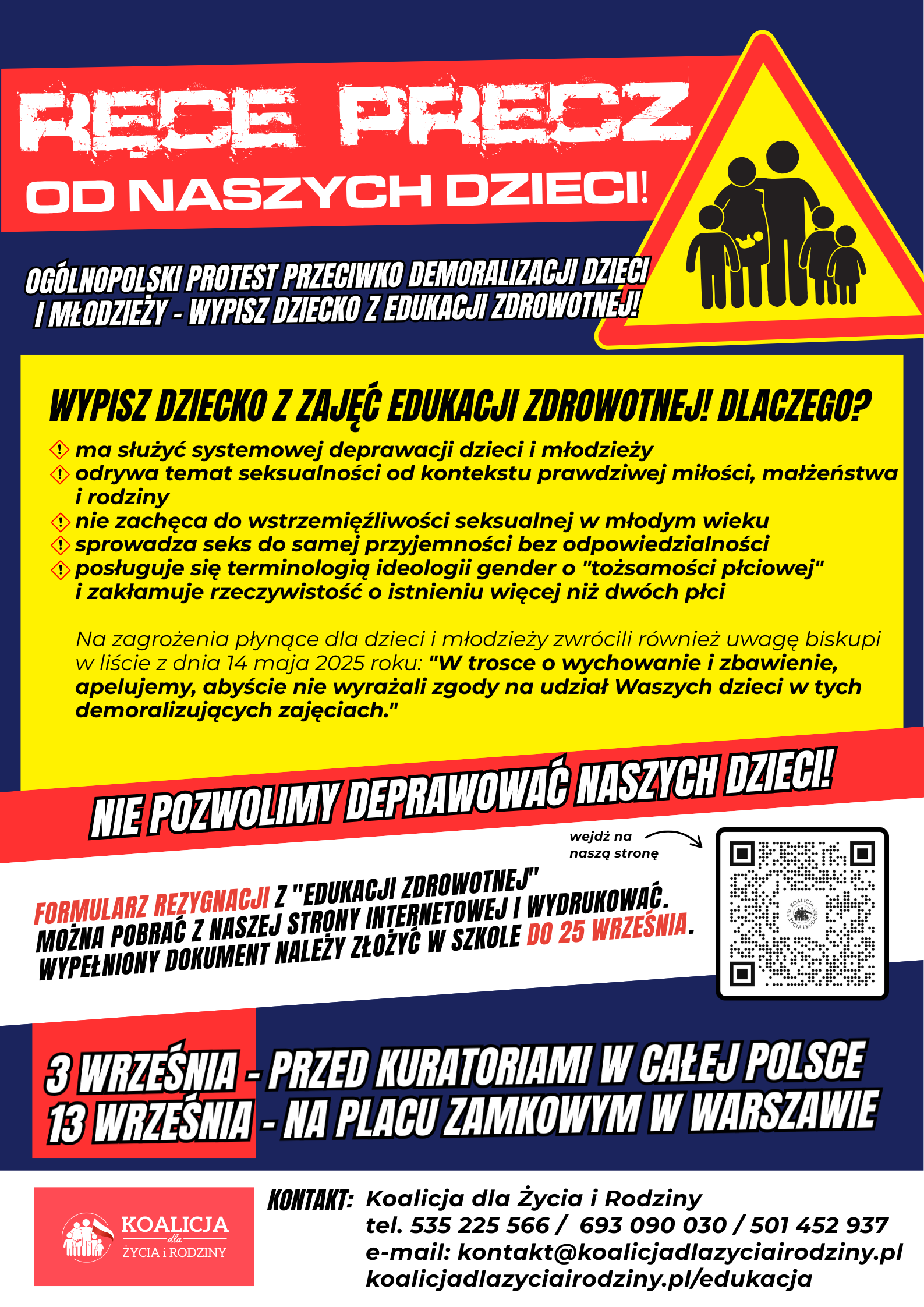Drodzy Rodzice! Przyszłość dzieci jest w Waszych rękach. Pamiętajcie, że jesteście w sumieniu przed Bogiem odpowiedzialni za ich prawidłowe wychowanie. Nie wolno Wam zgodzić się na systemową deprawację Waszych dzieci, która ma być prowadzona pod pretekstem tzw. edukacji zdrowotnej. W trosce o wychowanie i zbawienie, apelujemy, abyście nie wyrażali zgody na udział Waszych dzieci w tych demoralizujących zajęciach.